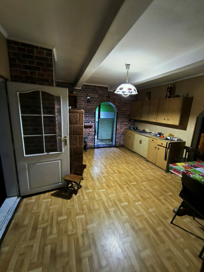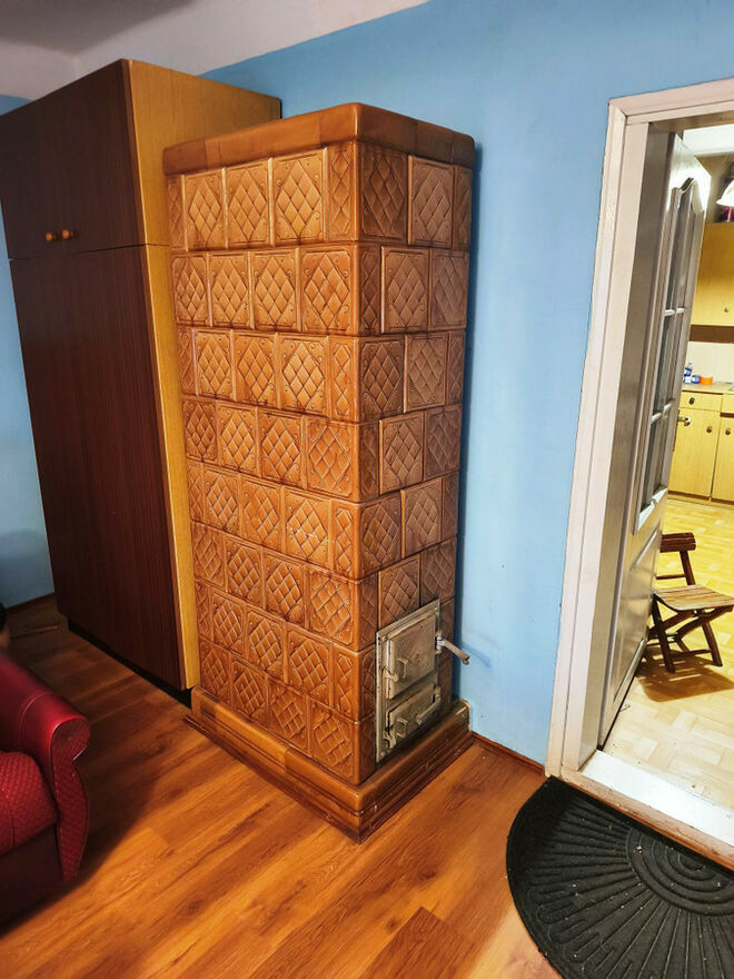 kuchnia z piecem kaflowym, podłogi drewniane – linoleum na podłodze.